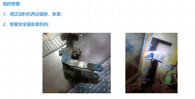 第二步,全力修复东面安全链张紧机构。针对断裂的支架,维修人员先拆除损坏的部件,重新加工制作了适配的支架配件,随后按照设备安装标准,将新支架精准安装到位,并对安全链的张紧度进行了重新调节,确保安全链能够正常发挥作用,避免链条再次出现偏移刮擦侧板的情况。文章源自炬鼎熔炉-江浙沪铝合金集中熔化炉厂家|中频感应熔炼炉|铝屑熔解炉报价-品牌直供·节能技术-https://www.judrl.com/5293.html
